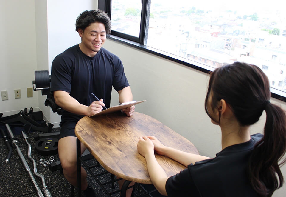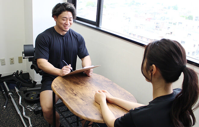 トレーナーからパーソナルトレーニングを進めていく為の、食事、運動、睡眠など現在の生活習慣を確認させて頂き、お客様の目標・目的に応じて必要なアドバイスをさせて頂きます。